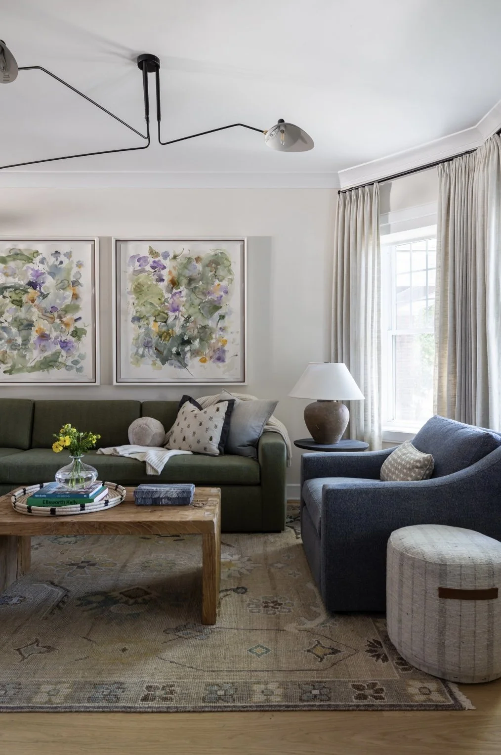 A living room with a green sofa, a dark blue armchair, a light wood coffee table, and a beige patterned ottoman. The room has large windows with cream-colored curtains, a table lamp with a ceramic base, and abstract floral artwork on the wall.