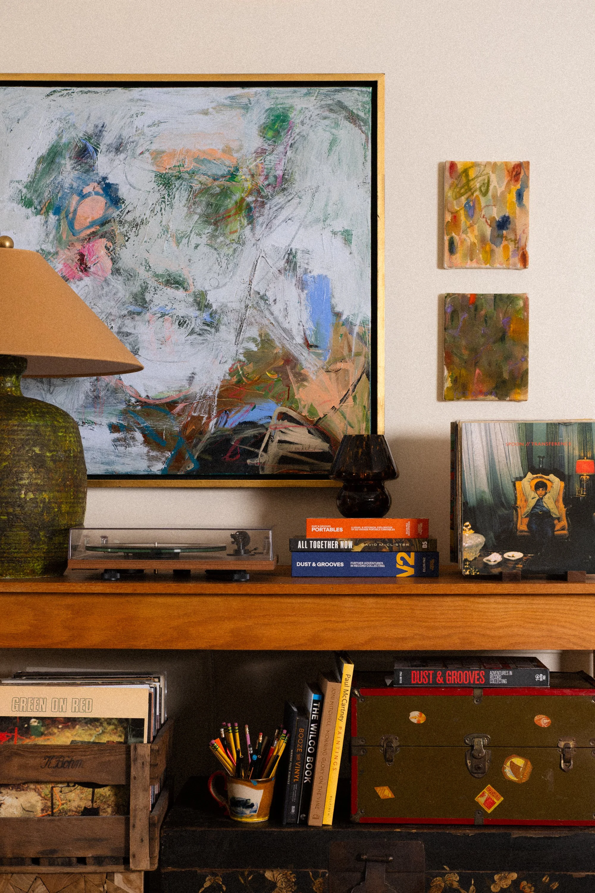 A wooden shelf with a vinyl record player, books, a decorative lamp, a teacup with pencils, and artwork on the wall, including an abstract painting and a framed album cover.